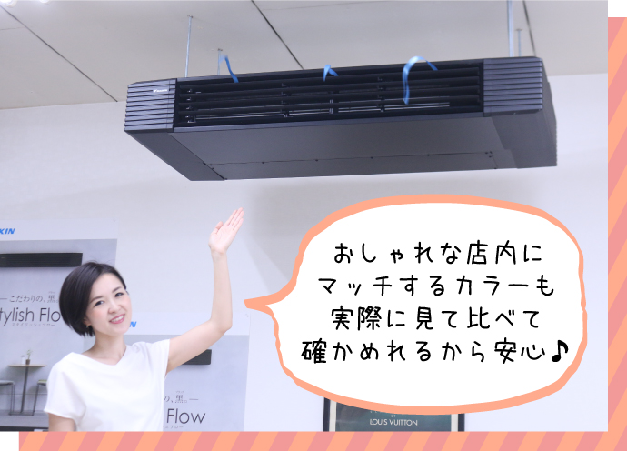 レイダン館のショールームは製品の操作性や各種機能をを確認・体感することができます。特にインターネットで製品を選ぶことに不安をお持ちの方や、製品の機能や特長をより詳しく知りたい方はご購入前に、レイダン館へお越しいただくことで、安心して業務用エアコンが設置出来ます。もちろん業務用のプロが常駐しておりますので、ご不明点がございましたらすぐにその場で解決させて頂きます。